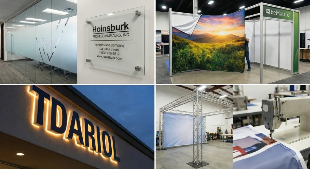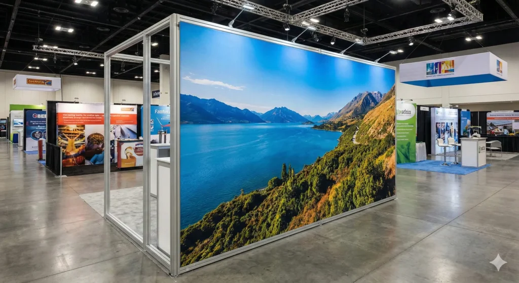 • Materiales resistentes: Vinilos, textiles y metacrilatos diseñados para soportar el uso intensivo en ferias y eventos.
