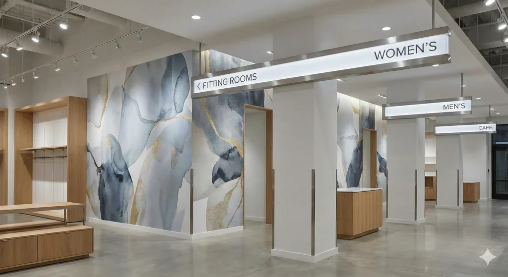 • Retail y espacios comerciales: Señalética interior y exterior para tiendas, hoteles y restaurantes.